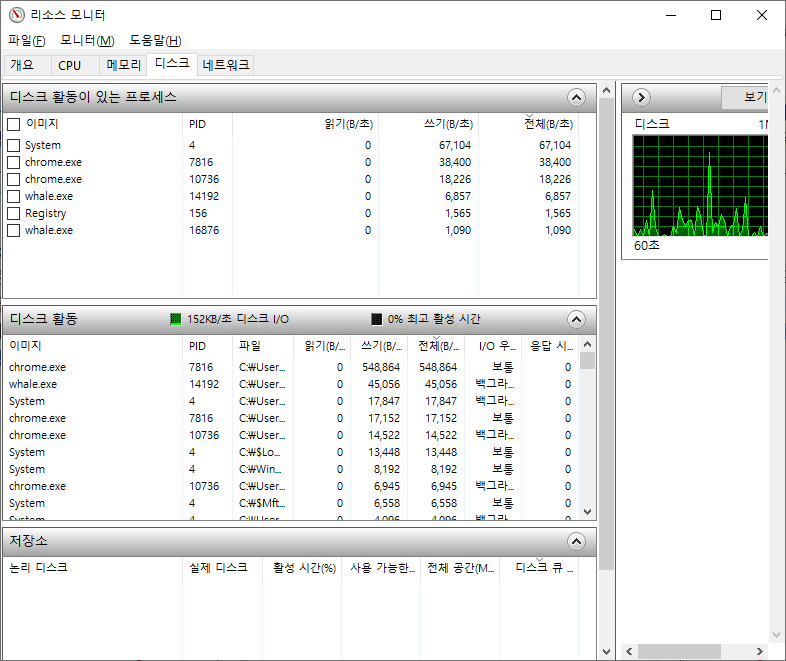 증상 찾기 : 하드 디스크의 현재 부하를 유발하는 프로그램을 찾는 가장 좋은 방법은 윈도우 리소스 모니터를 사용하는 것이다. 먼저 윈도우-R 키 조합을 누르고 실행 줄에 resmon을 입력한다. 디스크 탭에서 전체를 클릭하여 읽기/쓰기 활동에 따라 활성 프로세스를 정렬한다.