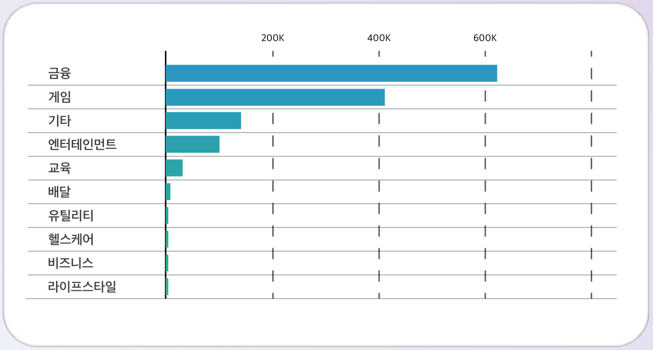 앱 한 개당 월 평균 공격 횟수는 금융 앱이 가장 많았으며 게임 앱이 그 다음이다. 아래는 카테고리 별 월 평균 공격을 나타낸 그래프인데, 월 평균 약 5만 회의 공격이 발생하였다. 금융, 게임, 기타, 엔터테이먼트 등 다양한 카테고리 별 공격에 대한 보안이 필요하다.
