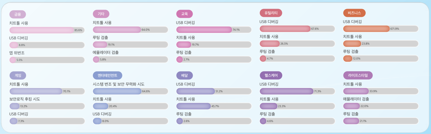 전체 카테고리에서 가장 많이 발생한 해킹 공격은 치트툴 사용이었으며, 시스템 변조 및 보안 무력화 시도, USB 디버깅 공격이 그 다음으로 많이 탐지되었다. 특히 게임과 금융 앱 등 금융정보와 같이 민간함 데이터를 보관하고 활용하는 앱에 대한 해킹 빈도가 증가하였다.