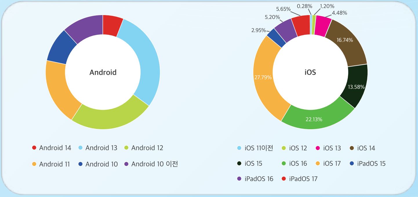 모바일 앱에 시도된 해킹 데이터를 확인하면 사용자가 많은 최신 OS에 가해진 해킹 공격도 많지만, 구형 OS에 가해지는 해킹이 더 많다는 것을 확인할 수 있다. 안드로이드의 경우 94.56% 공격이 구형 OS에서 발생했으며, iOS는 65.56% 공격이 구형 OS에서 발생 하였다. 이렇듯 업데이트 되지 않은 앱에 더 많은 공격이 발생하기 때문에 앱을 안전하게 보호하기 위해서 OS에 대한 조치도 필요하다.(ex. 최신 폰을 사용하는것)