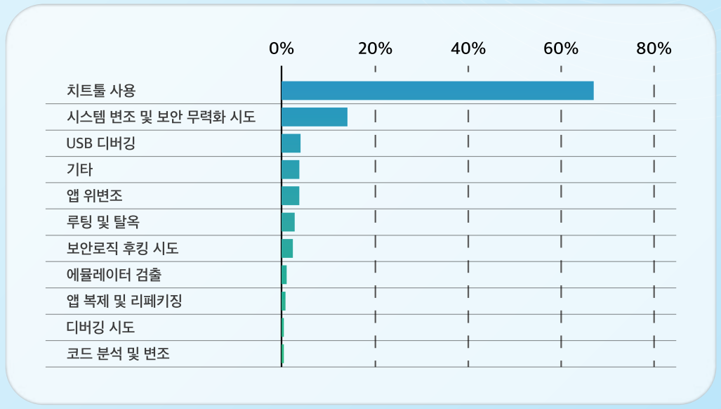 위의 해킹 공격 중 치트툴 공격 비중이 높았으며, USB 디버깅, 디버깅 공격, 그리고 보안 모듈 우회 공격 등이 많이 발생 하였다.
